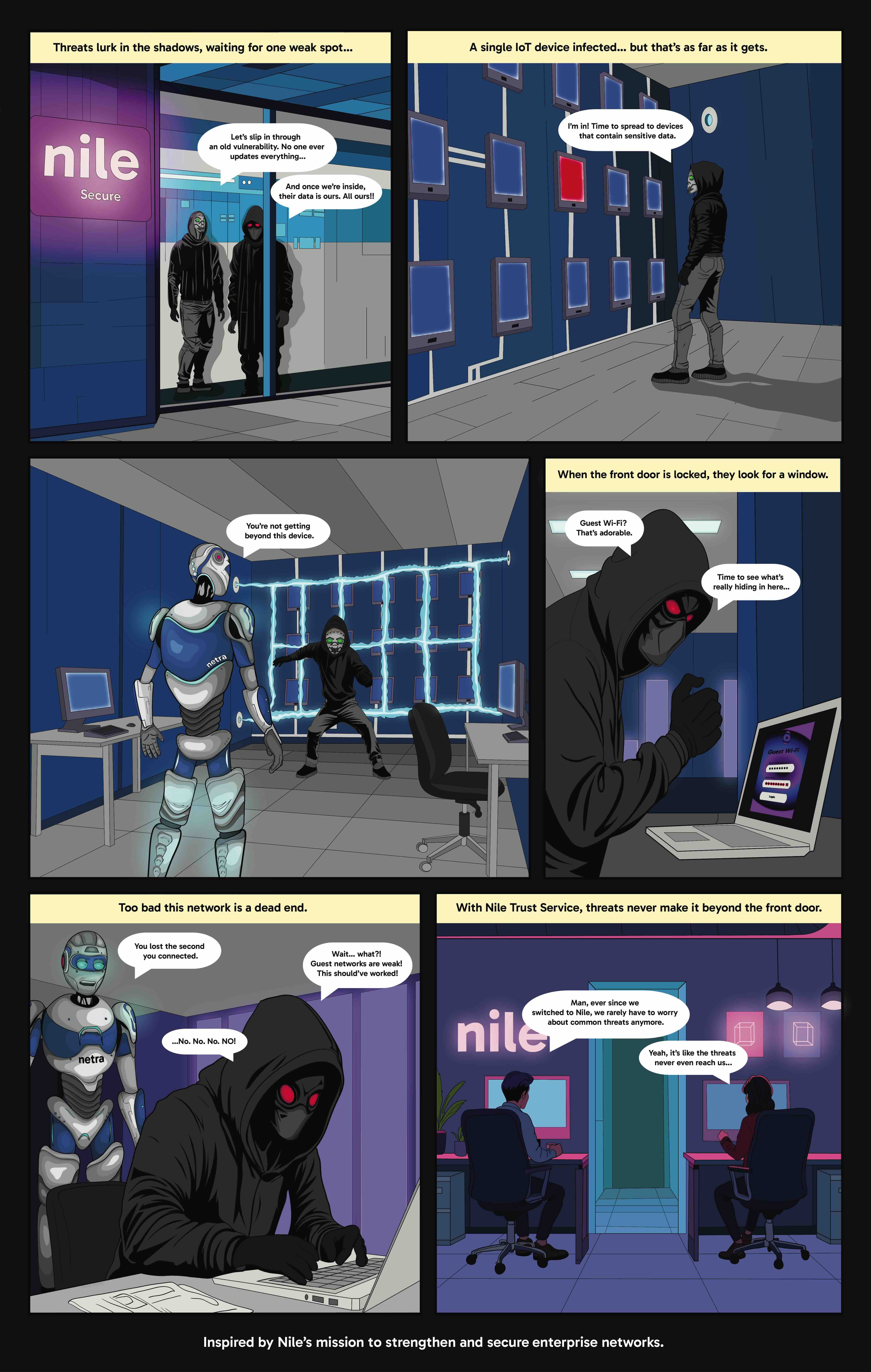 each strip distills a complex security topic into a quick, memorable narrative. the visual style matches nile secure's brand while keeping the tone human and slightly playful.